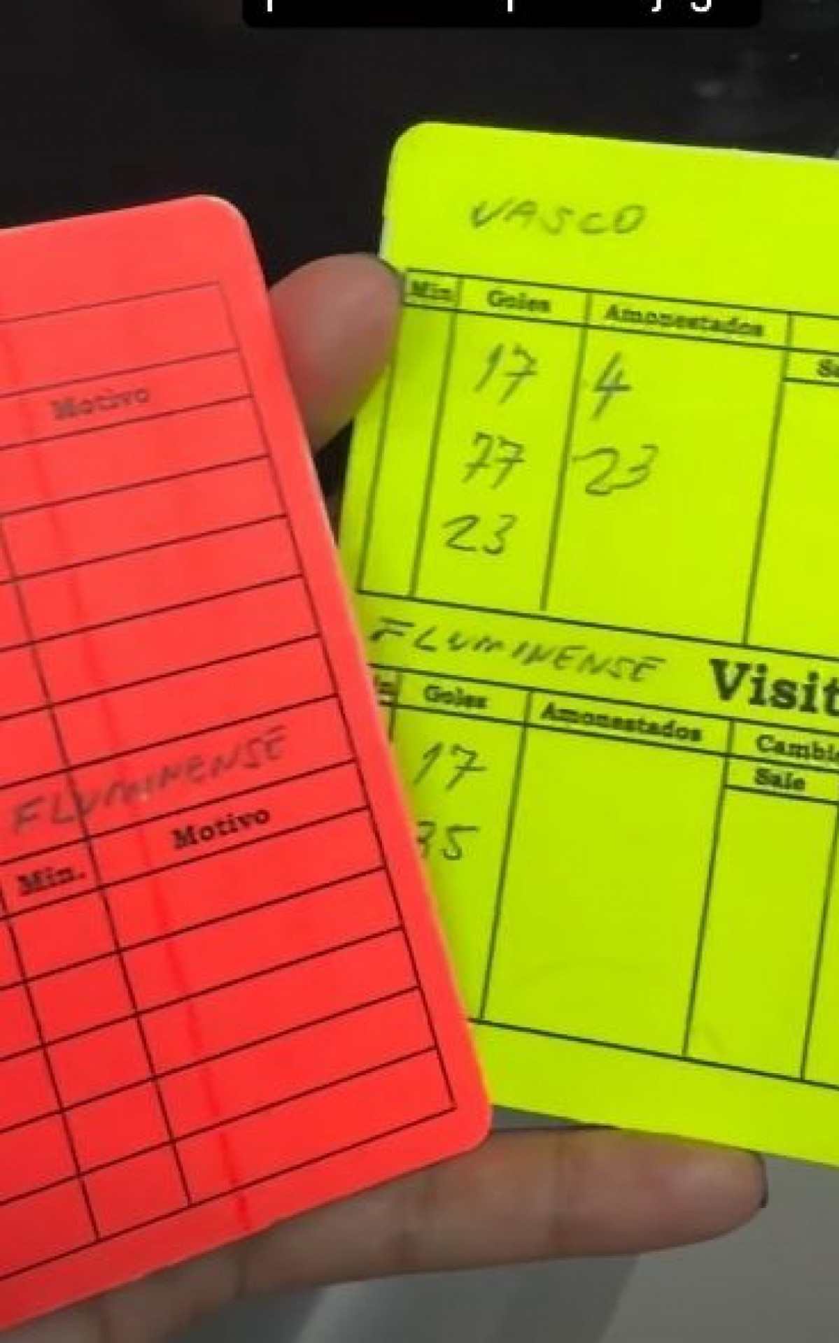 "Thiago chegou em casa com o cartão do jogo. O juiz deu de presente para ele (Thiago Mendes). Ele estava me contando aqui. Olha o cartão amarelo que ele ganhou. Mas esse cartão eu estou vendo meio laranja, não é vermelho, não. Será que estou daltônica? E o amarelo é meio esverdeado", disse Kelly Mendes.