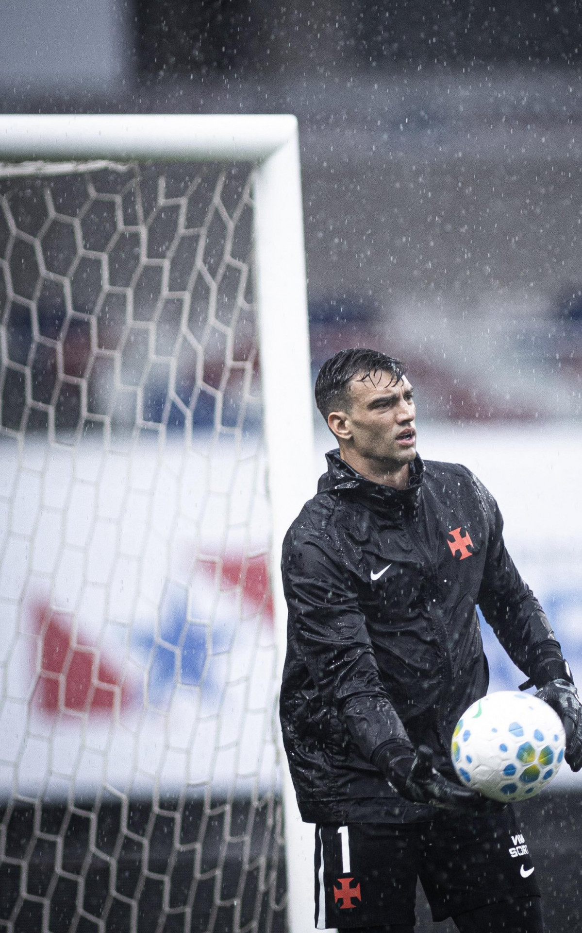 Léo Jardim em aquecimento sob forte chuva no MangueirãoMatheus Lima / Vasco