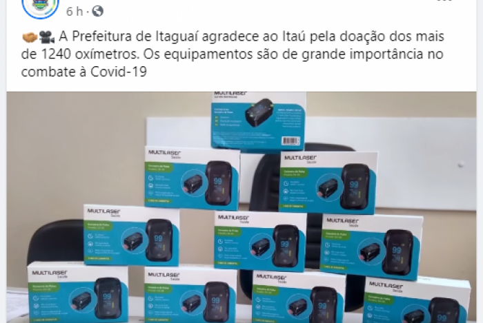 DOAÇÃO DE PROJETO SOCIAL O texto da postagem no Facebook da prefeitura que acompanha o vídeo diz o seguinte: “A Prefeitura de Itaguaí agradece ao Itaú pela doação dos mais de 1240 oxímetros. Os equipamentos são de grande importância no combate à Covid-19”. Durante a fala de Zóia, uma imagem dos equipamentos empilhados aparece, para, em seguida, cortar para finalizar com o agradecimento do secretário.