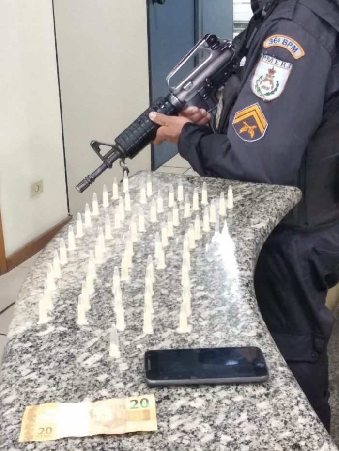 MIRACEMA - Militares do 36° BPM (Santo Antônio de Pádua-RJ) junto com policiais civis da 137ª DP de Miracema, no Noroeste Fluminense, foram à Rua Capitão Sena, no bairro Santa Tereza, cumprir mandado de busca e apreensão em desfavor de um homem de 29 anos. Durante diligência na residência do suspeito, em uma gaveta do guarda roupas, foram encontrados 61 pinos contendo cocaína pesando 36,5 gramas; R$20 e um aparelho celular. O rapaz assumiu a propriedade da droga. O caso foi registrado no plantão, na 136ª DP, onde o envolvido foi autuado com base no Art. 33 da lei 11.343/2006 ficando o mesmo preso sob os cuidados da Polícia Civil.