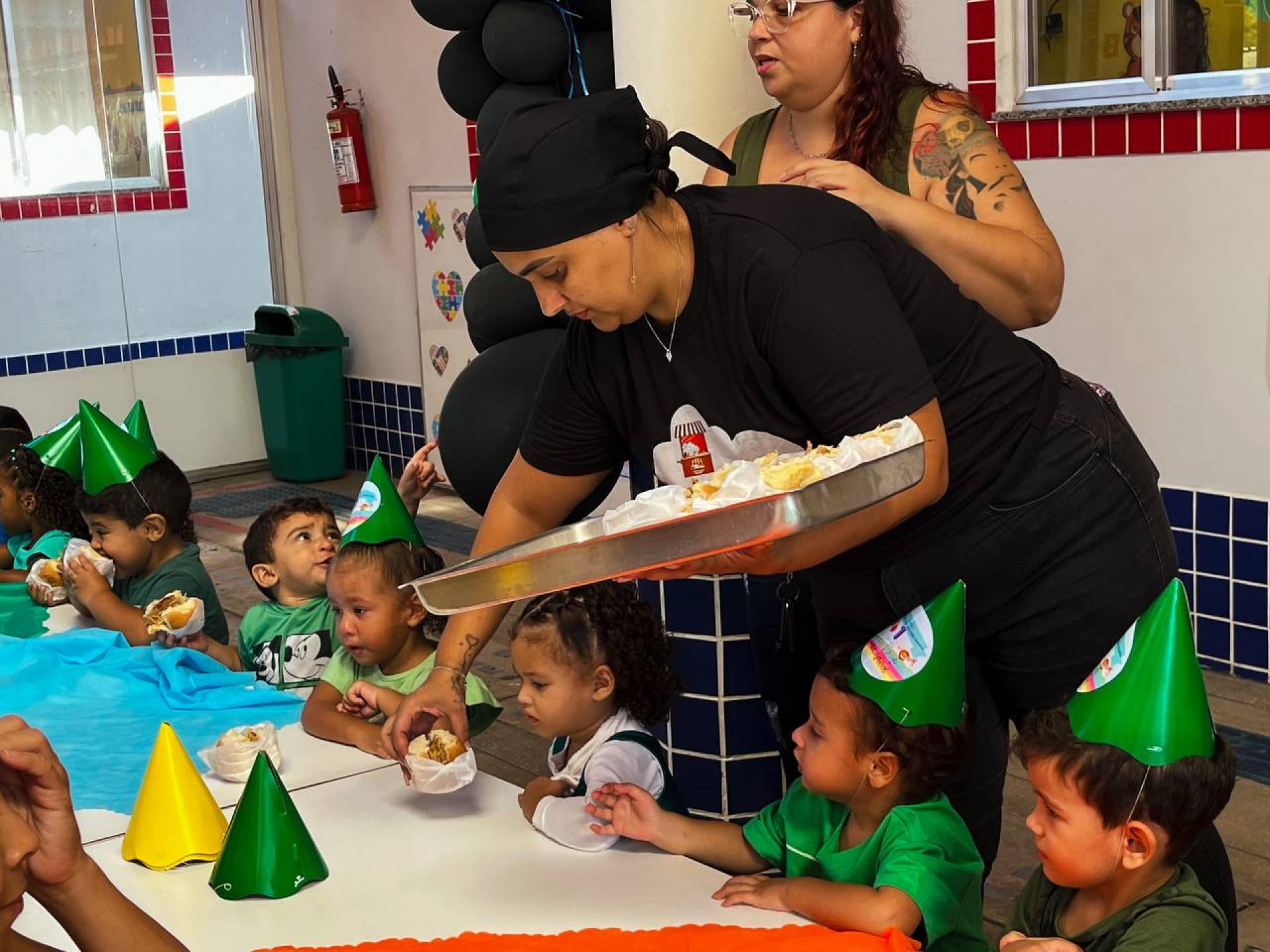 Ao mesmo tempo que se encantaram com todo o cenário colorido e vivo, alguns pequenos se lambuzaram literalmente com os doces e alimentos oferecidos. E é claro que não faltaram sorrisos e até choro dos pequeninos, que queriam mesmo era brincar e aproveitar o colo das “tias”.