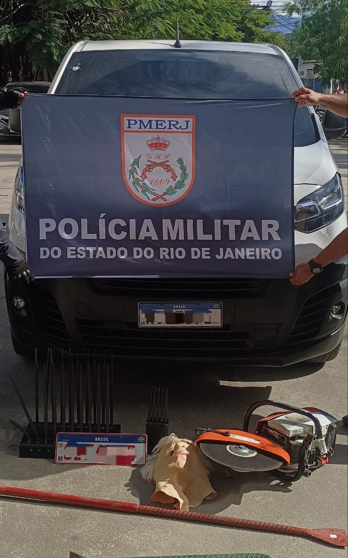 Com os presos, foram apreendidos toucas ninja, uma máscara, dois jammers, usados para bloquear o sinal de rastreadores, e um equipamento para cortar metal e facilitar o acesso à cargaDivulgação / PMERJ