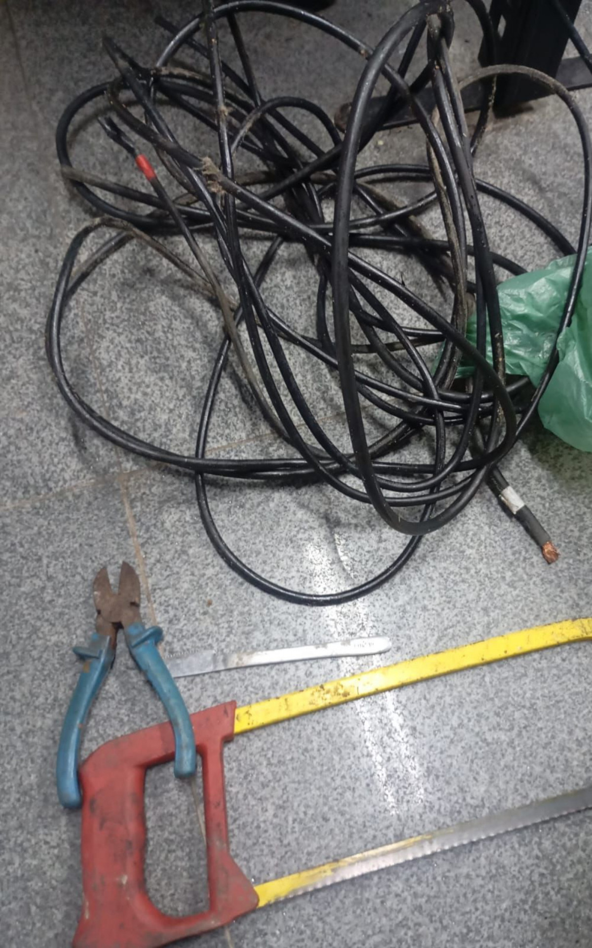 Durante a abordagem, os policiais localizaram os cabos de energia que estavam sendo retirados do local, além de ferramentas usadas para cortar e remover o material. Todo o equipamento foi recolhido como prova da ocorrência.