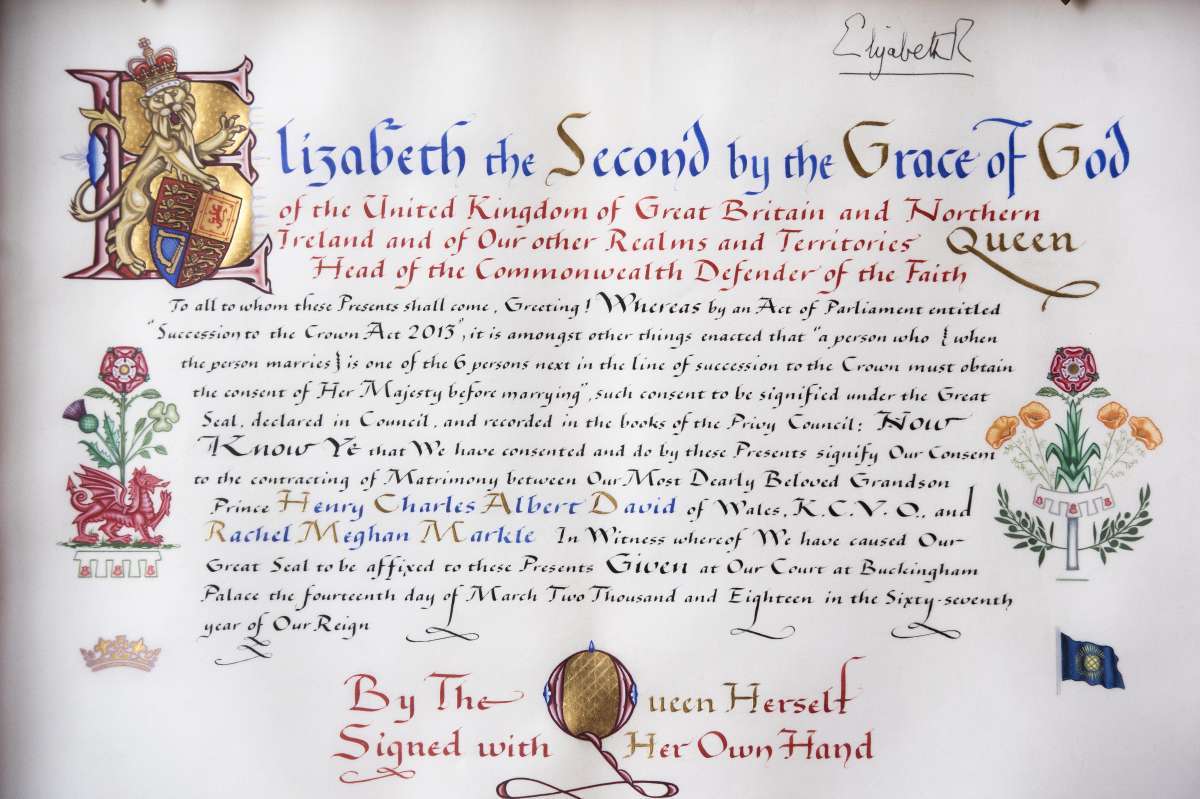 O documento é manuscrito e iluminado em pergaminho e selado com o Grande Selo do Reino. A assinatura da rainha, "Elizabeth R", pode ser vista no canto superior direito do documento, que será apresentado ao príncipe Harry e Meghan Markle após o casamento.