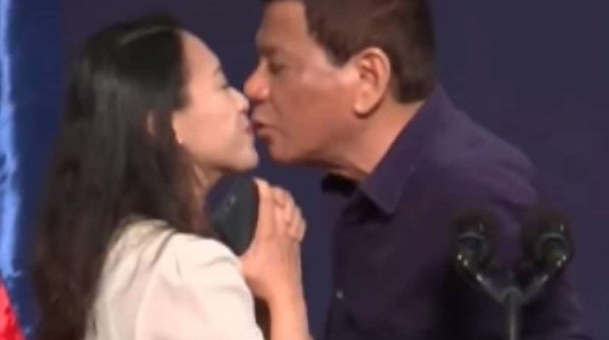 Filipinas - O presidente filipino Rodrigo Duterte gerou controvérsia ao pressionar uma mulher casada a beijá-lo na boca diante de milhares de apoiadores neste domingo. A cena aconteceu durante um ato público com trabalhadores filipinos da Coreia do Sul. Duterte chamou a mulher ao palco para lhe dar um livro.