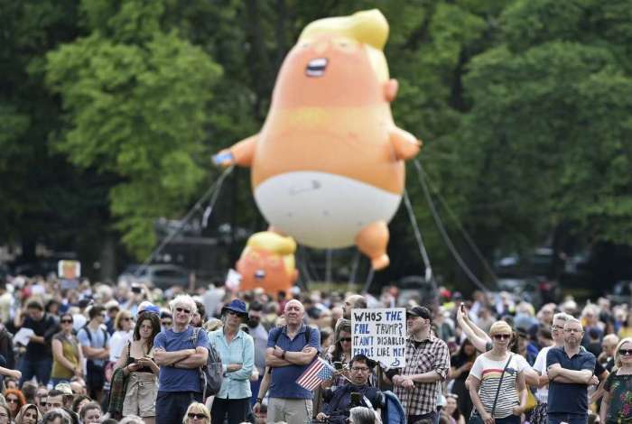 Turnberry - Milhares de pessoas foram às ruas de Edimburgo neste sábado protestando contra Donald Trump, que conclui sua visita ao Reino Unido aproveitando seu privado complexo hoteleiro de Turnberry, na Escócia, após ter provocado mal-estar ao atacar a estratégia da primeira-ministra britânica, Theresa May, para o Brexit.