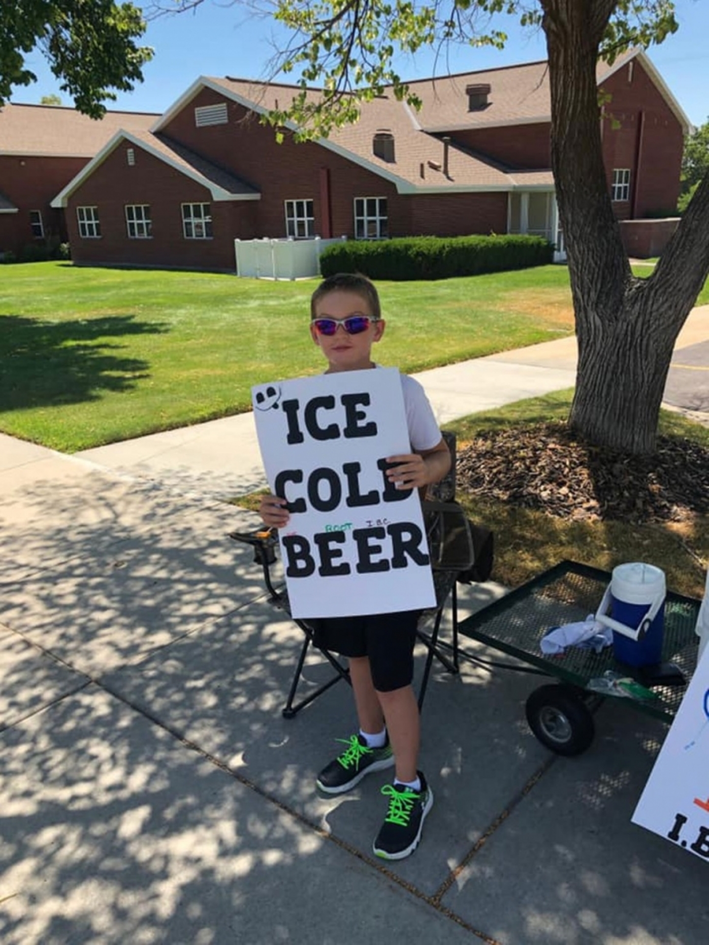 O pequeno segurava um cartaz escrito "Ice cold beer" (cerveja bem gelada), mas, ele utilizou das famosas letras miúdas, e entre as palavras grandes estava escrito "root bier", um popular refresco americano.