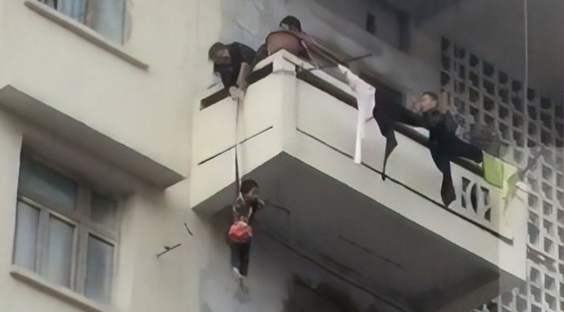 O momento do resgate foi filmado e é possível ver o garoto se equilibrando na borda da sacada. Ao colocar o gato dentro de um saco, ele é puxado de volta para cima com a ajuda do tio dele.