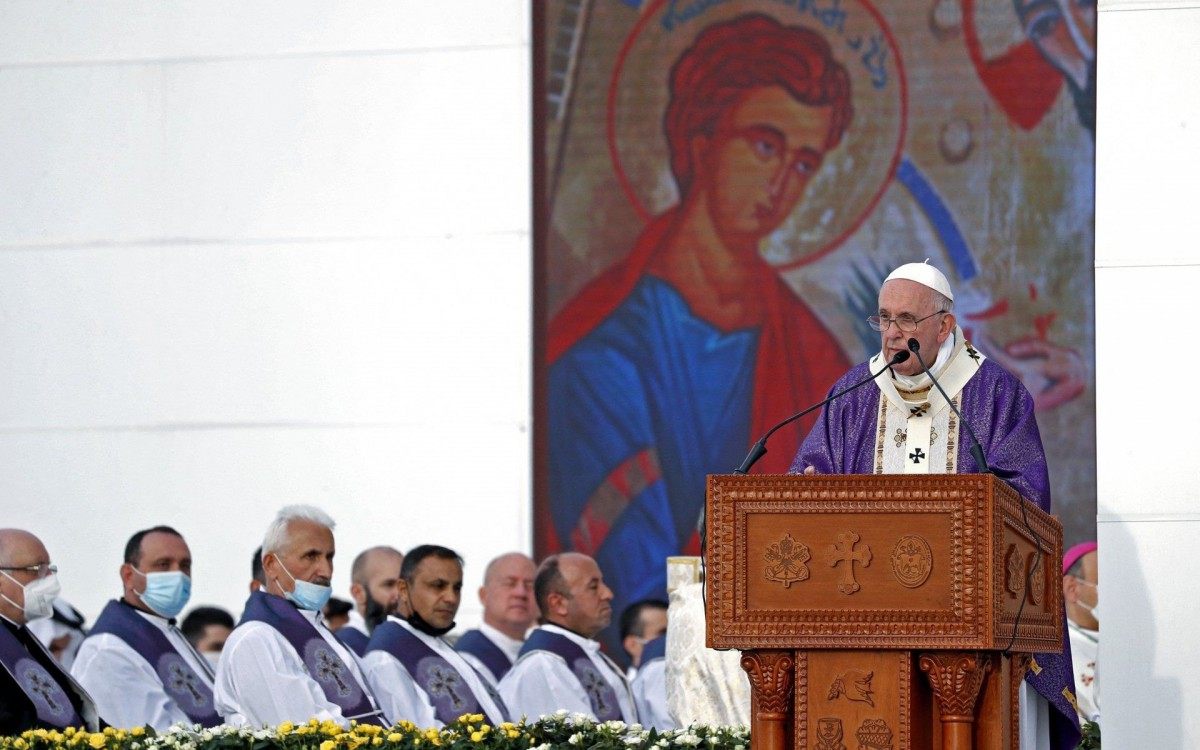O papa iniciou a missa em latim, com a peregrineta roxa nas costas e o solidéu branco na cabeça, diante de uma assembleia silenciosa e recolhida no último dia de sua visita ao Iraque, a primeira de um sumo pontífice ao país.
