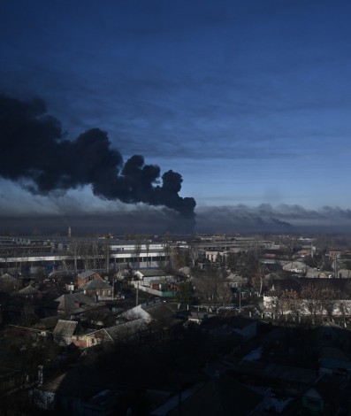 Fumaça preta sobe de um aeroporto militar em Chuguyev, perto de Kharkiv, na UcrâniaAFP