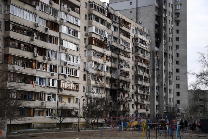 Edifício residencial danificado na rua Koshytsa, subúrbio da capital ucraniana KievAFP