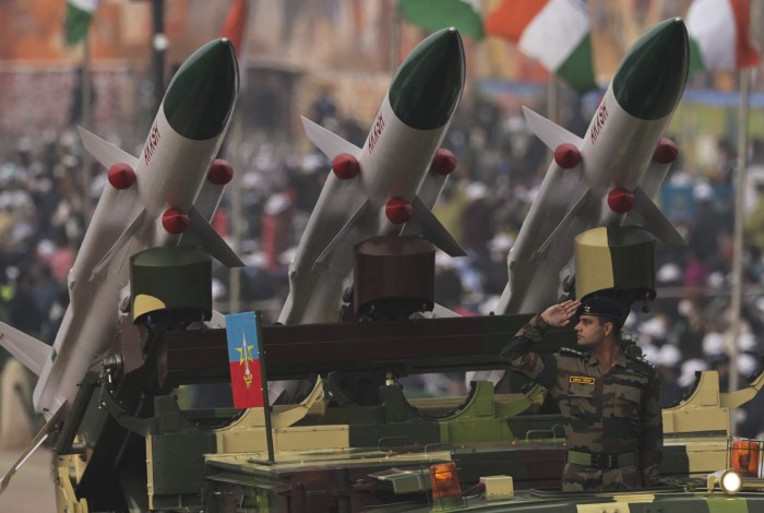 Soldado faz continência ao lado de um sistema de mísseis Akash durante o desfile do 73º Dia da República da Índia em janeiroAFP