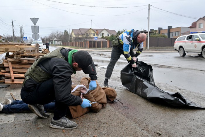 Correspondentes da AFP observaram no sábado ao menos 20 cadáveres com roupas civis em apenas uma rua de Bucha. Um homem tinha as mãos amarradas às costas, com o passaporte ucraniano ao lado do corpo.