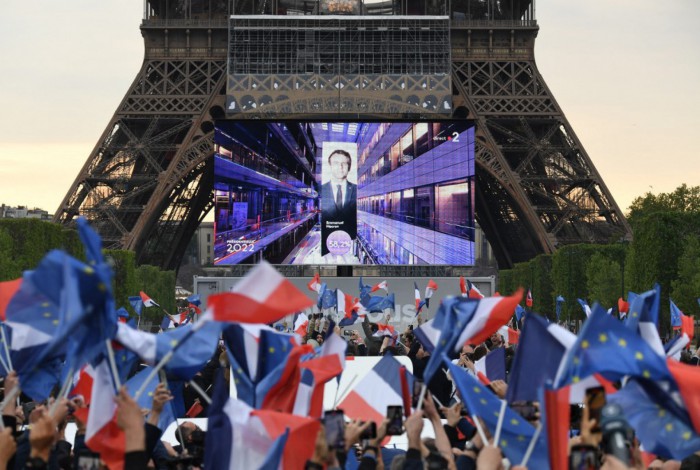 O presidente francês Emmanuel Macron foi reeleito, neste domingo (24), para um segundo mandato ao derrotar sua rival de extrema-direita Marine Le Pen, de acordo com as primeiras estimativas de institutos de pesquisa.