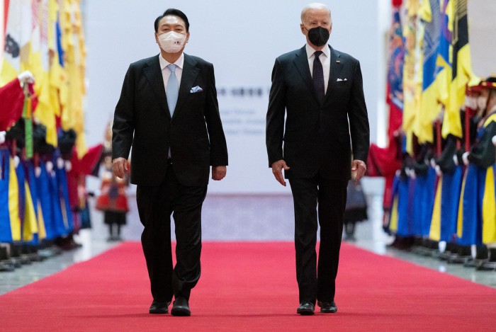 No encontro em Seul, Yoon Suk Yeol e Joe Biden demonstraram preocupação com o investimento da Coréia do Norte em armas nuclearesAFP