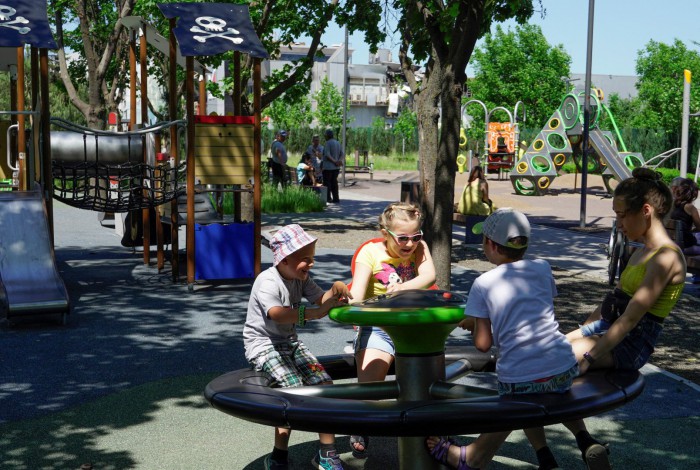 Crianças brincam numa praça em Mariupol que resistiu aos ataques dos bombardeios do exército russoAFP