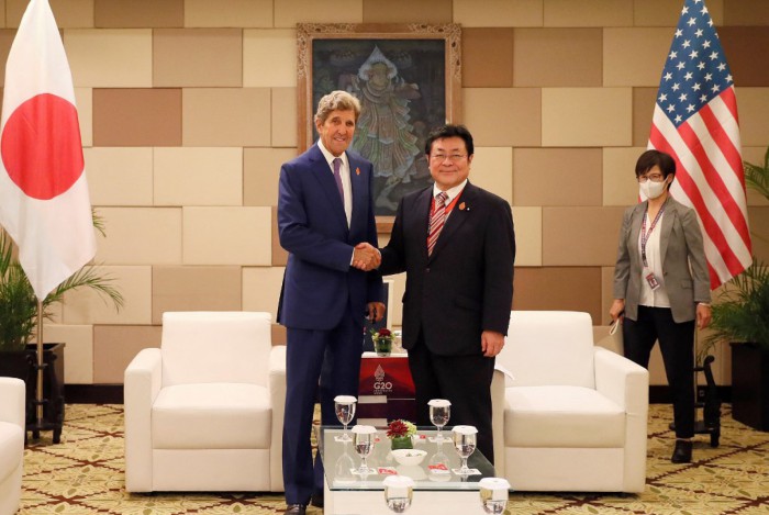 Ministro do Meio Ambiente do Japão, Akihiro Nishimura (D), cumprimenta o Enviado Presidencial Especial dos EUA para o Clima, John Kerry (E)NUSA DUA, INDONÉSIA