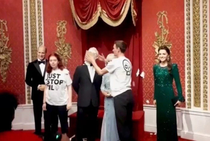 Two supporters of Just Stop Oil have covered a Madame Tussauds waxwork model of King Charles III with chocolate cake, demanding that the Government halts all new oil and gas licences and consents.#FreeLouis #FreeJosh #A22Network pic.twitter.com/p0DJ8v3XVB