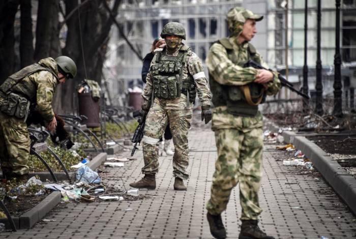 Soldados russos na cidade Mariupol, na Ucrânia.AFP