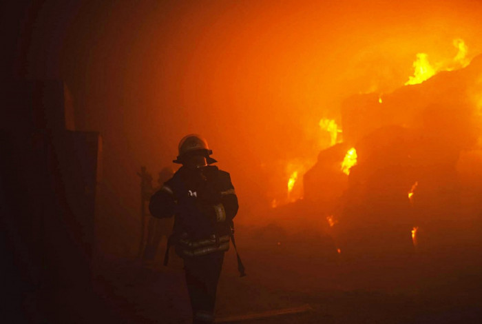 Socorrista apaga incêndio em um prédio após queda de destroços devido um ataque massivo de dronesPAVLO PETROV / STATE EMERGENCY SERVICE OF UKRAINE / AFP