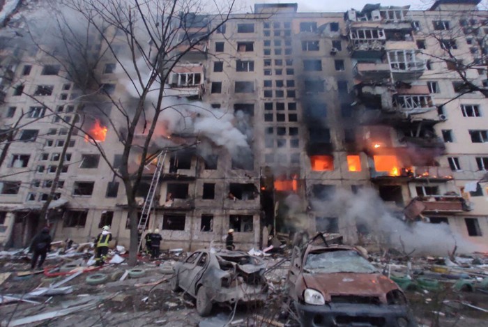 A Força Aérea Ucraniana destruiu todos os veículos não tripulados, mas os destroços caíram em um prédio residencial alto e iniciaram um incêndio, disseram as autoridades.