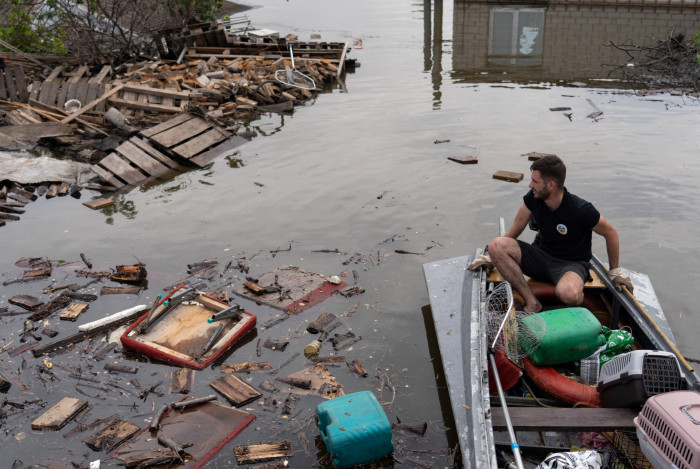 voluntário de resgate de animais se move entre detritos flutuantes em um barco nas águas da enchente em KhersonAFP