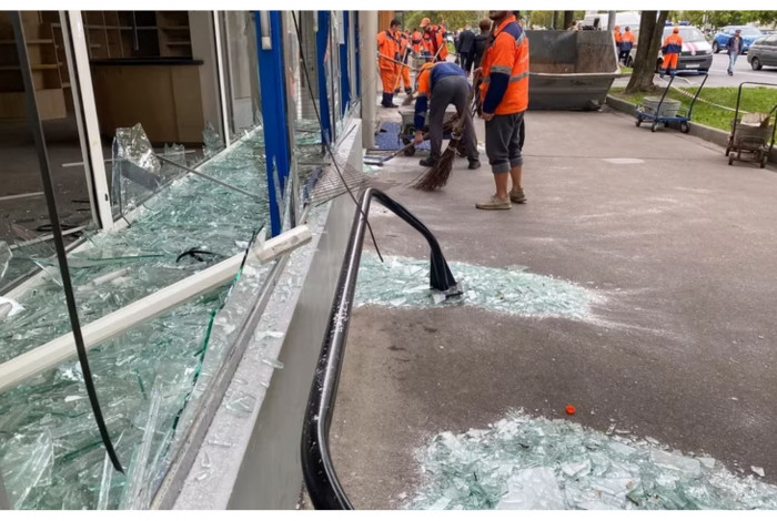Outro drone alcançou o centro comercial da rua Likhacheva, onde uma fotógrafa da AFP viu várias janelas quebradas no alto de um edifício.