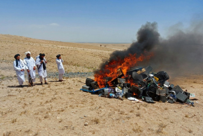 As autoridades do Talibã acenderam uma fogueira em uma província do oeste do Afeganistão neste fim de semana e jogaram instrumentos musicais e equipamentos nas chamas, por considerarem a música algo imoral.