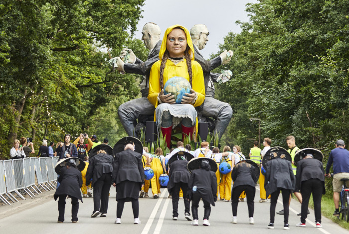 Referência do ativismo ambiental, Greta Thunberg foi tema de um carro alegórico em um evento na SuéciaAFP