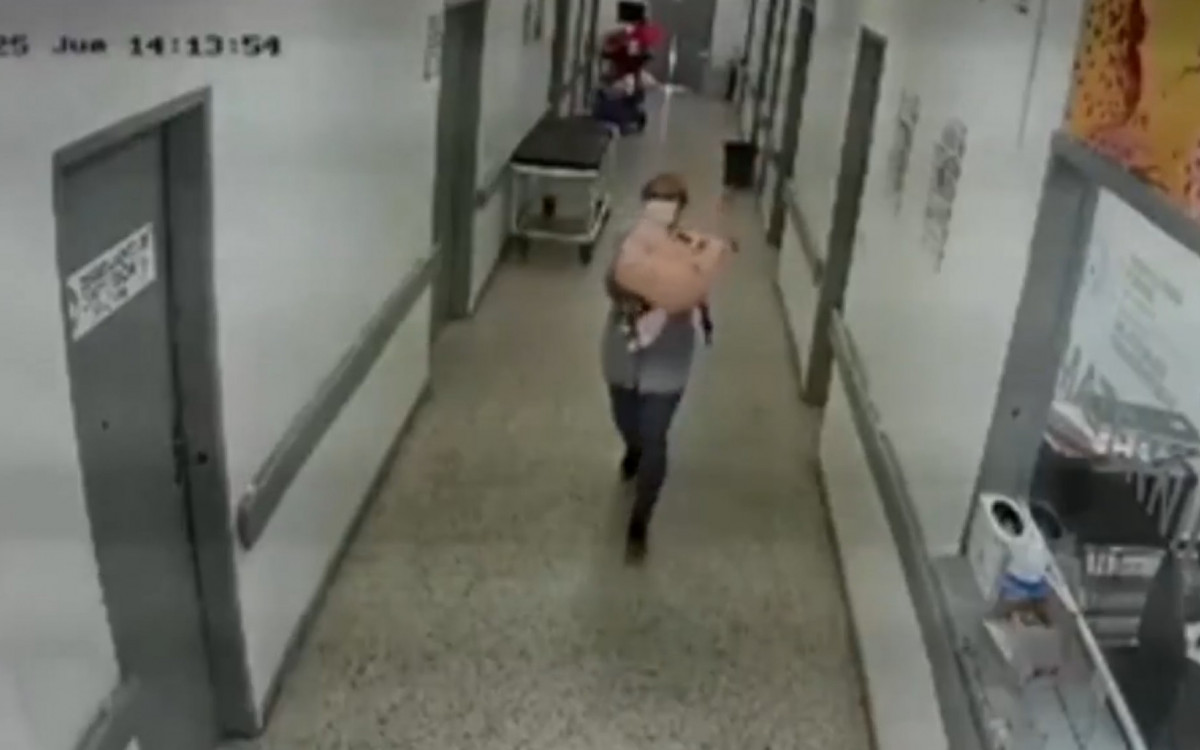 Imagens das câmeras de segurança mostram a investigada, vestida de enfermeira, levando o bebê para fora do hospital.