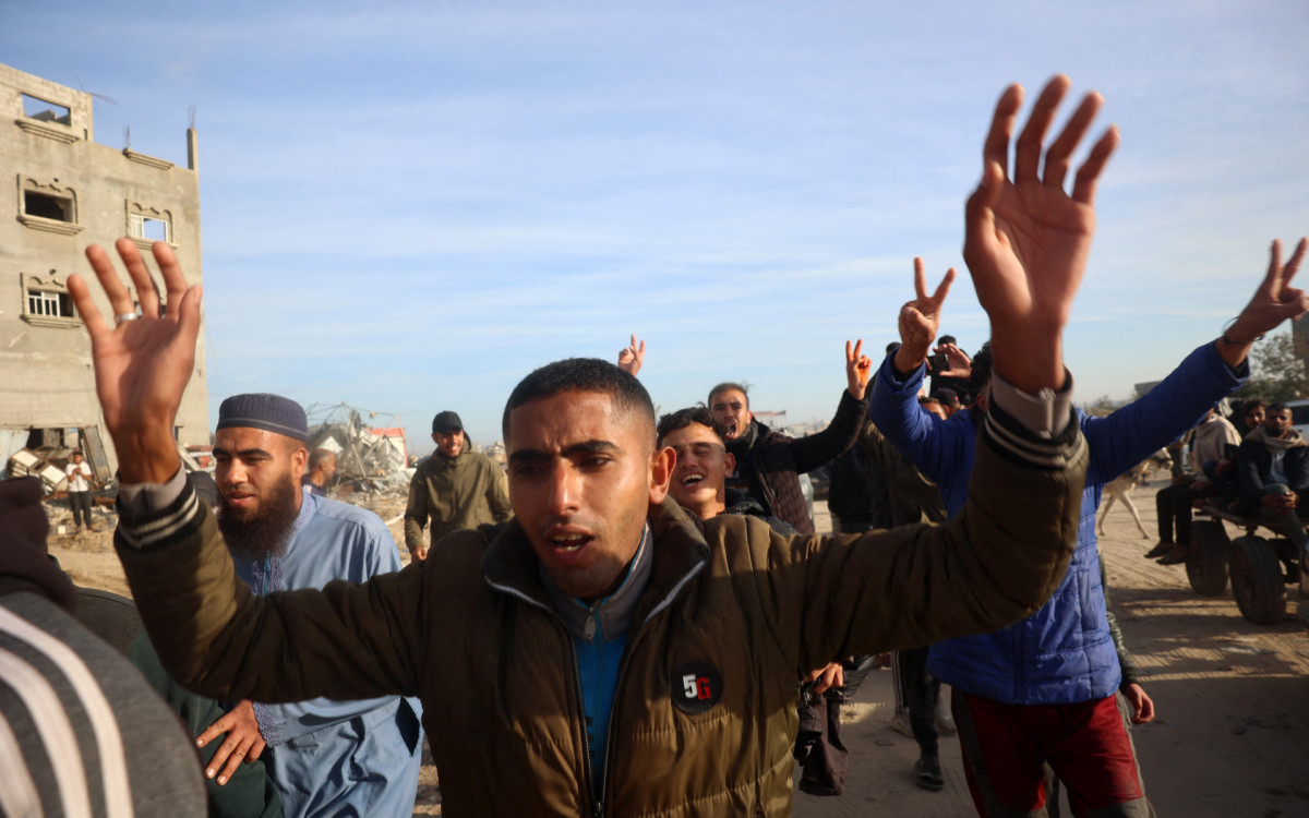 Imagens transmitidas neste sábado mostraram alguns dos prisioneiros, vestindo roupas esportivas cinza, descendo de dois ônibus no lado egípcio da fronteira de Rafah com Gaza.