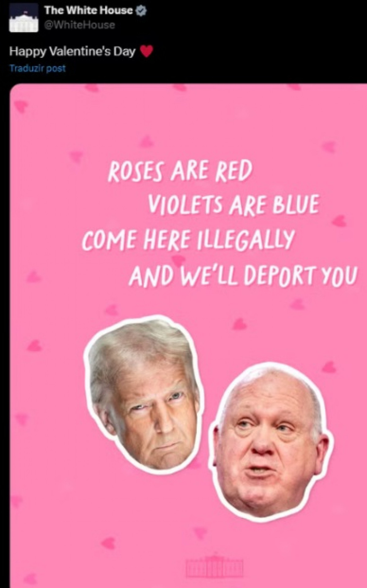 Casa Branca compartilha poema de Dia dos Namorados com migrantes como alvo: 'deportaremos você'Reprodução