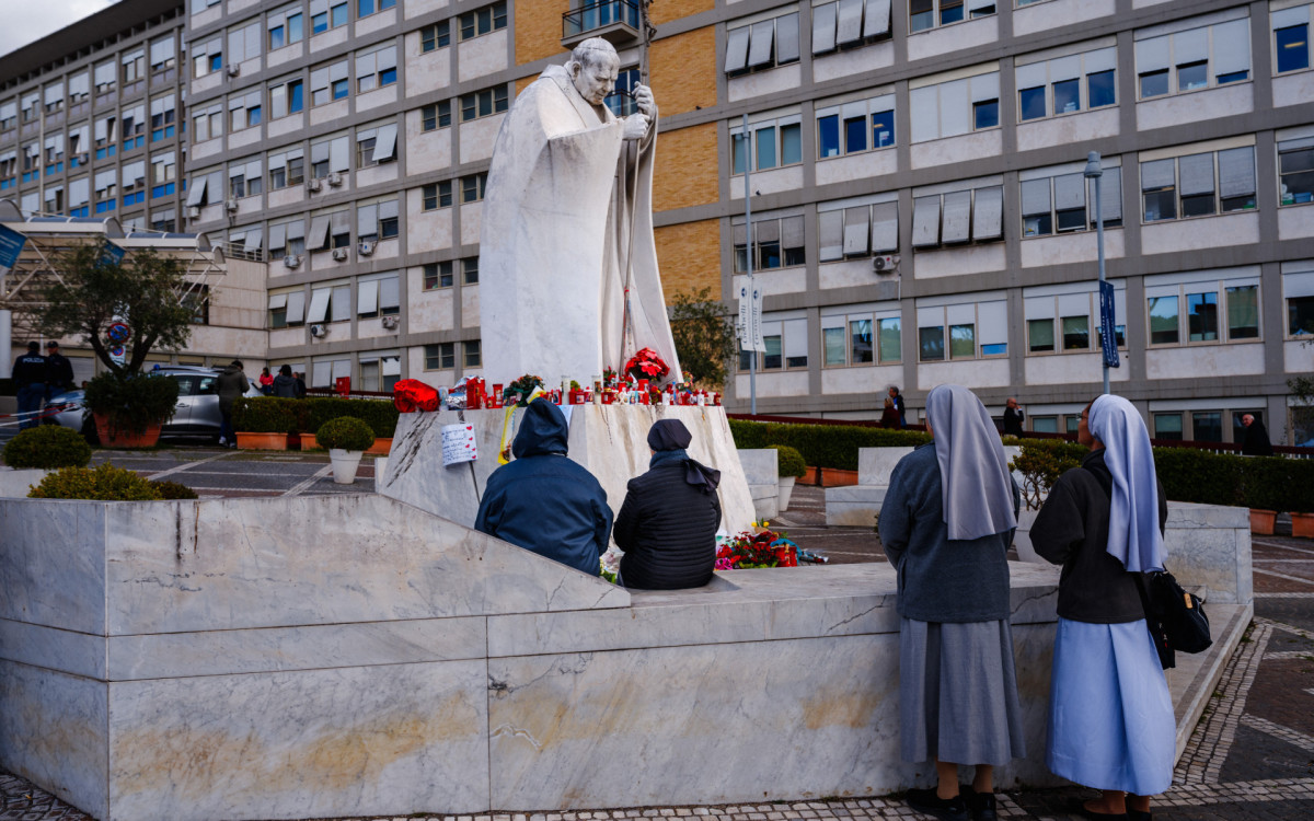 Em frente à estátua do falecido João Paulo II, fiéis rezam pelo Papa FranciscoAFP
