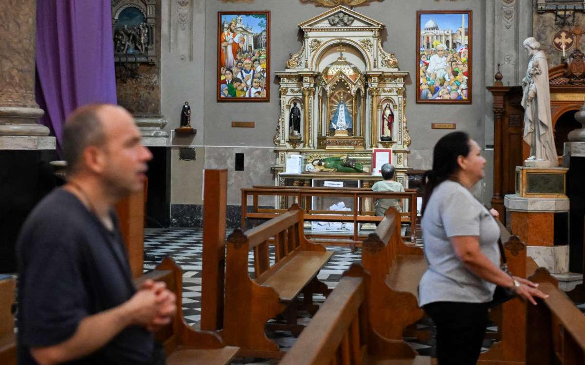 Após a liturgia, os fiéis rezaram em frente a retratos do papa distribuídos ao longo da Basílica de São José de Flores, um templo icônico na história do pontífice.