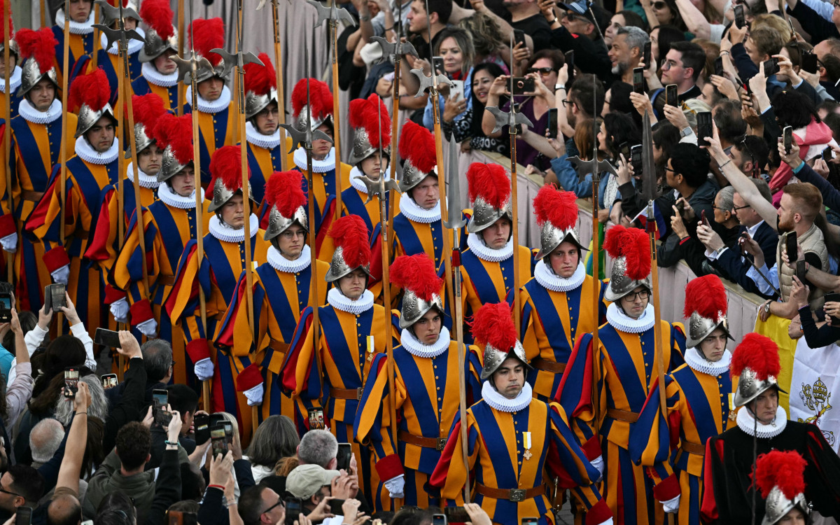 Após a definição do novo pontífice, a centenária Guarda Suíça Pontifícia desfila pela Praça São Pedro. Fundada em 1506, e considerada uma das forças de segurança armada mais antigas do mundo, é um elemento importante na história e no funcionamento atual do Vaticano.
