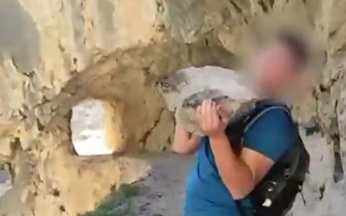 Um vídeo que circula nas redes sociais mostra o homem, que ainda não foi identificado, erguendo a rocha até a altura dos ombros e atirando o objeto. Segundos depois é possível ouvir o impacto do objeto com o solo.