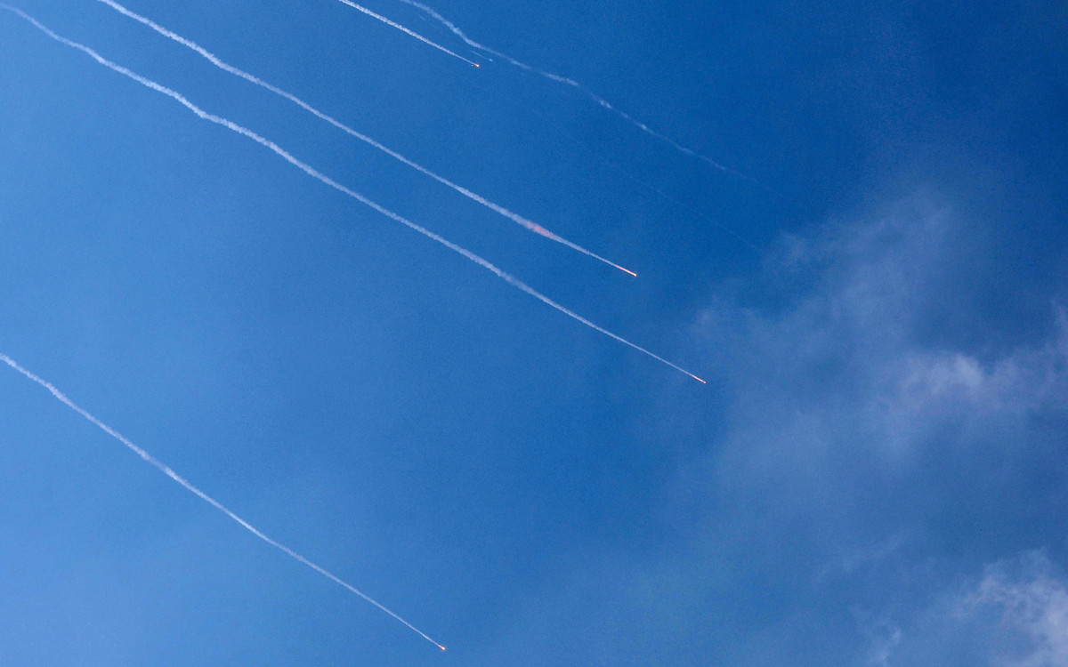 Rastros de foguetes sobre a cidade costeira israelense de Netanya, em meio a uma nova barragem de mísseis iranianos AFP