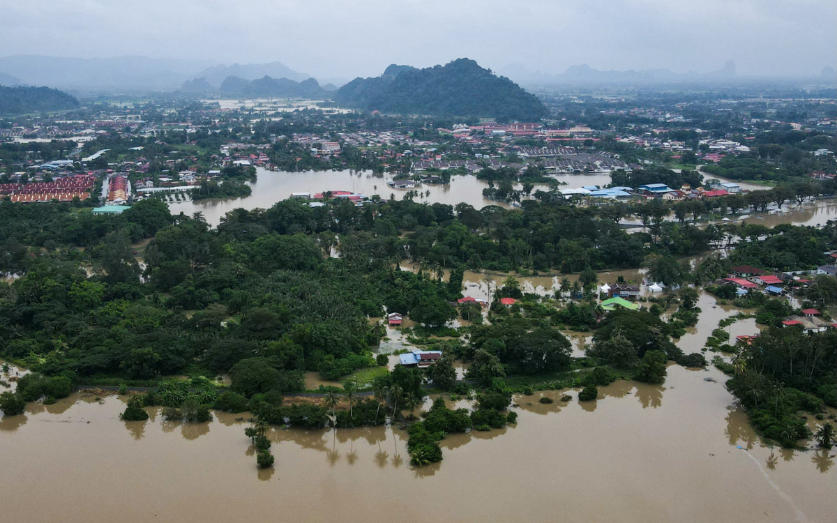 Vista aérea mostra áreas residenciais cercadas por águas da enchente norte da MalásiaAFP