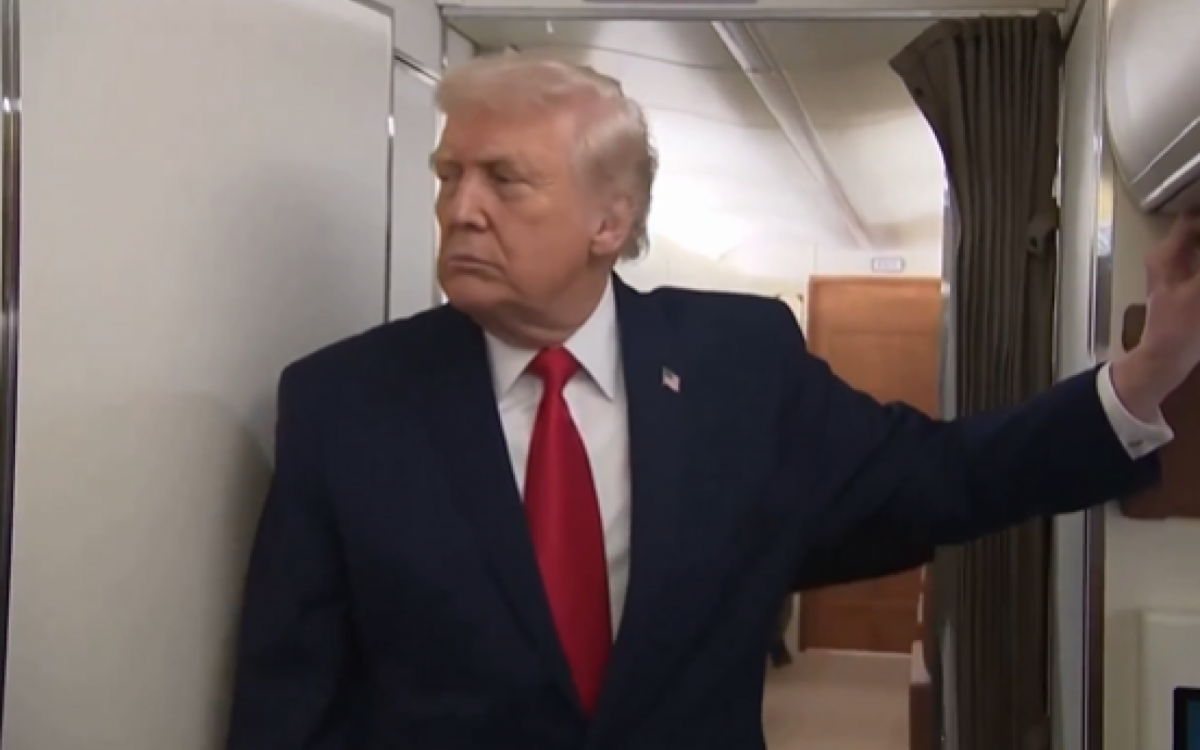 O presidente dos Estados Unidos, Donald Trump, foi interrompido, nesta terça-feira (9), enquanto concedia uma entrevista a jornalistas a bordo do Air Force One, por um assessor que saiu do banheiro. O momento viralizou nas redes sociais.