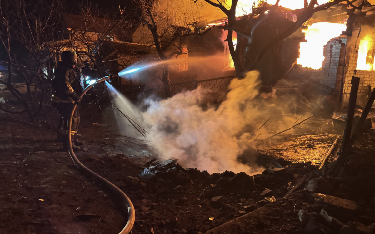 Bombeiros combatem incêndio em residência após um ataque de drone em ZaporizhzhiaAFP