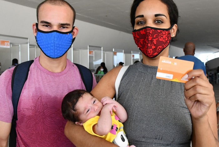 Moradores do Cantagalo, Fabiane Gomes, de 35 anos, e Diego Clistofer, de 28 anos, foram com a pequena Isabelle, de dois meses, pegar o cartão.