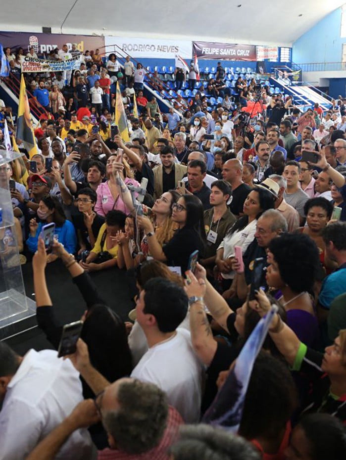 Em seguida, Ciro apontou Rodrigo Neves como candidato ideal para recuperar o estado ao citar as experiências de governança em Niterói. “Rodrigo governou de forma exemplar a cidade de Niterói. Todo mundo deve olhar em Niterói a semente que prova provadamente que o Rodrigo sabe fazer, sabe trabalhar. Nós estamos entregando ao estado do Rio de Janeiro um talentosíssimo administrador público. O Rio de Janeiro tem uma oportunidade de ouro por si e pelo Brasil. O Rio de Janeiro vai dizer a si mesmo e ao povo brasileiro que vale a pena ser decente, porque Rodrigo Neves e Felipe Santa Cruz são homens limpos, honrados, decentes e aguentam pancada até da manipulação da Justiça. Elegendo esta chapa o Rio de Janeiro estará se libertando de 20 anos de molecagem, de roubalheira e de conivência do estado com o banditismo cruel que mata a maioria do nosso povo. Rio de Janeiro, de pé! A mudança chegou!”, disse Ciro Gomes.