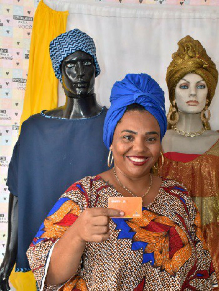 Dona de um ateliê, Jaqueline Terra é uma das beneficiárias que, além do valor mensal, também passou a aceitar a moeda social nas transações do seu negócio. Moradora do Largo da Batalha, ela tem 37 anos e dois filhos.