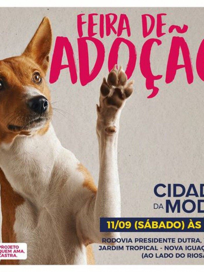 O pólo Cidade da Moda promove neste sábado (11) uma feira de adoção de animais em sua sede, na Rodovia Presidente Dutra. O horário será de 10h às 16h. Para os interessados em adotar algum bichinho, é preciso levar um documento de identidade, comprovante de residência e passar por uma entrevista social na hora.