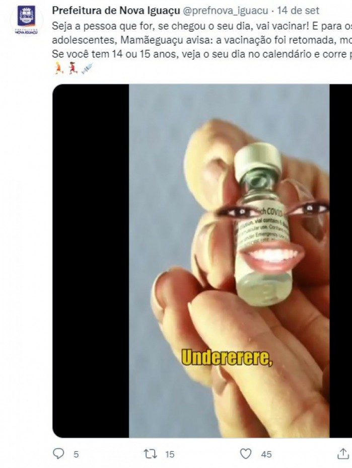 Conhecida pelo bom humor nas suas redes sociais, a Prefeitura de Nova Iguaçu virou assunto dos mais comentados no mundo virtual nesta semana ao convocar os adolescentes para a vacinação contra a Covid-19 nos postos do município da Baixada Fluminense. A equipe de comunicação utilizou uma paródia da música ‘Undererê’, da cantora Inês Brasil.