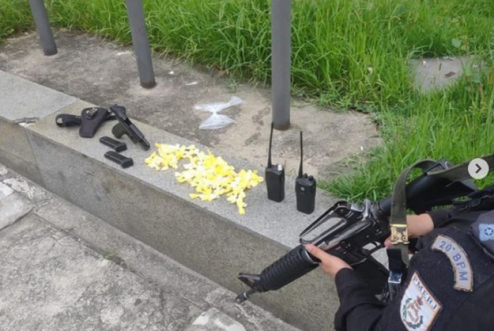 Houve confronto e os agentes conseguiram render dois criminosos. Com a dupla, foram apreendidos uma pistola, dois carregadores, munições, rádios comunicadores e 100 papelotes de cocaína.