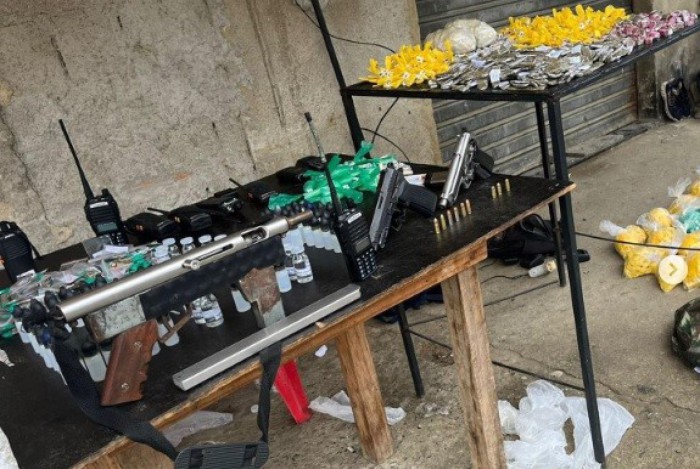Com os suspeitos, foram apreendidos três pistolas, uma sub-metralhadora, 11 rádios transmissores, munições, uma granada, além de 654 tabletes e 570 embalagens de maconha de maconha, 5.300 pinos e 620 sacolés de cocaína, 80 frascos de Lóló, 101 pedras de crack. No fim, foram retiradas, oito toneladas de barricadas da comunidade.