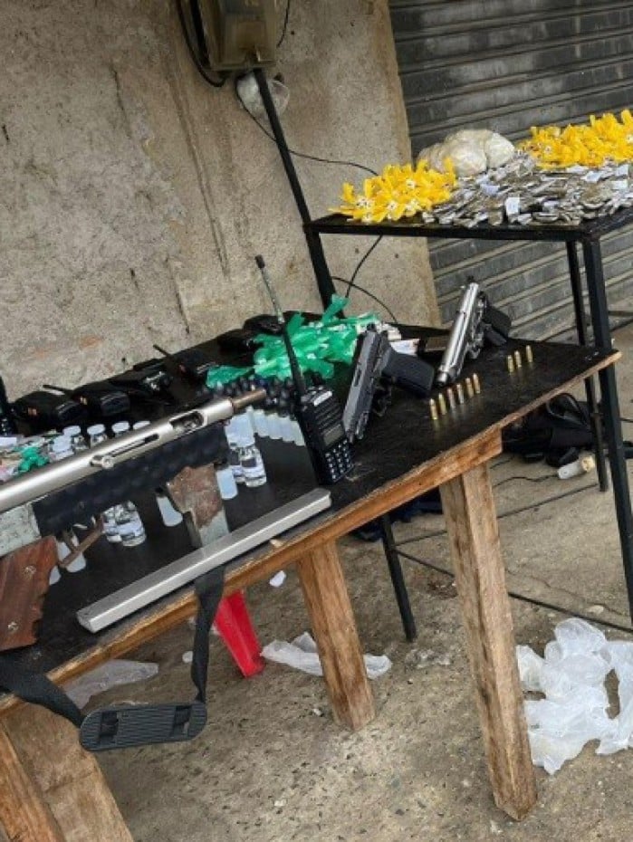 Com os suspeitos, foram apreendidos três pistolas, uma sub-metralhadora, 11 rádios transmissores, munições, uma granada, além de 654 tabletes e 570 embalagens de maconha de maconha, 5.300 pinos e 620 sacolés de cocaína, 80 frascos de Lóló, 101 pedras de crack. No fim, foram retiradas, oito toneladas de barricadas da comunidade.