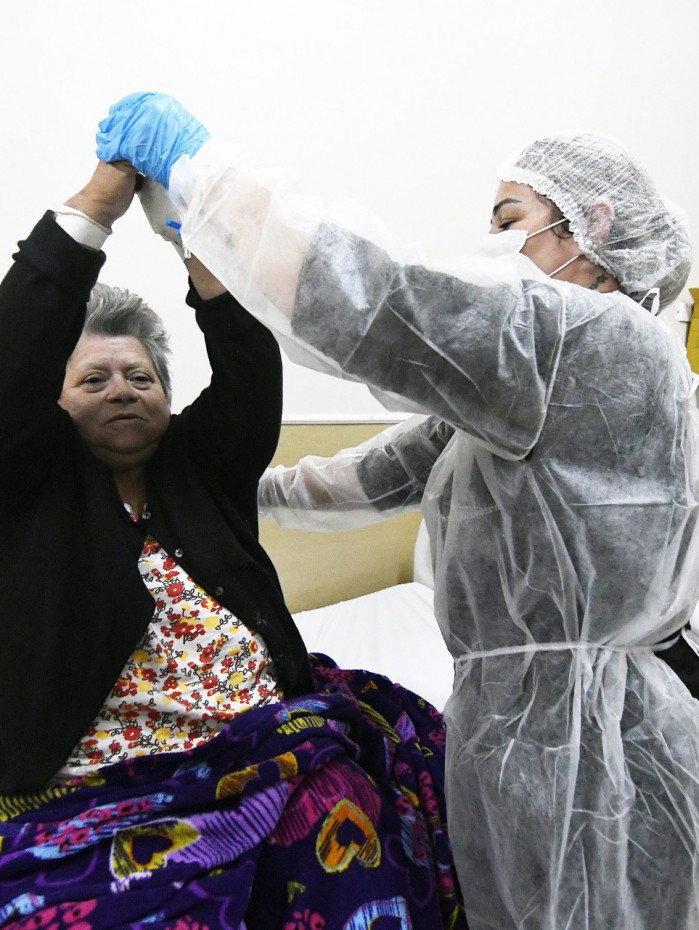 Internada há cerca de uma semana para tratar de uma infecção, Dacleusa Marques Porto, de 70 anos, têm dificuldades para andar. Além dos cuidados médicos, a idosa também está recebendo assistência da equipe de fisioterapia que a acompanha diariamente, promovendo exercícios para reabilitar suas funções motoras, como movimentar os braços e ajudar a caminhar pela enfermaria.