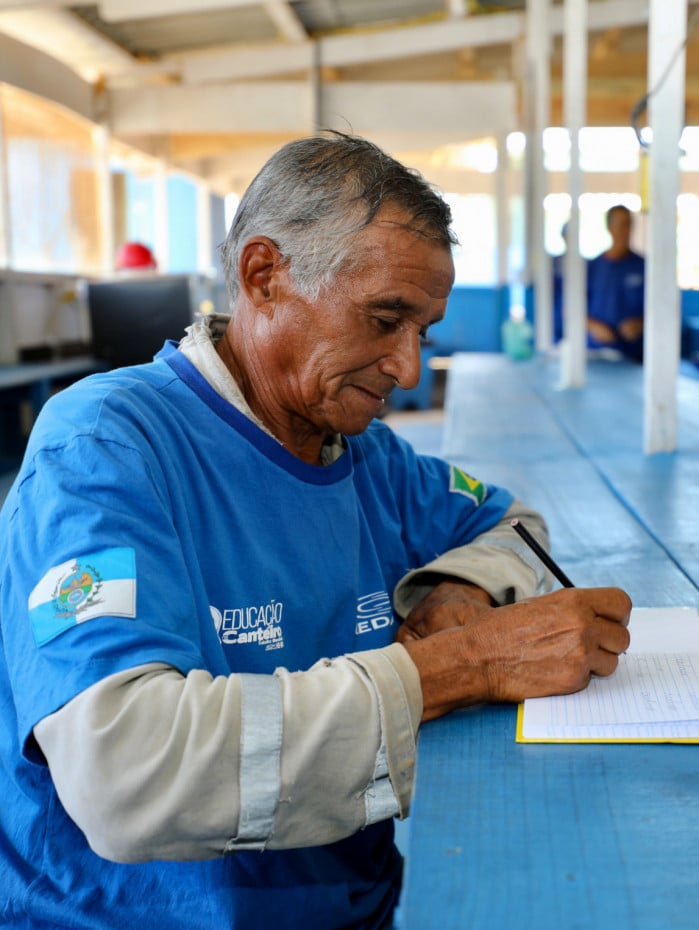 Outro aluno, Genaíno Lucas bate no peito, aponta para o céu e agradece a Deus pela oportunidade que caiu em suas mãos calejadas de tanto serviço pesado. Com décadas de profissão, se tornou especialista em preparar as armações das estruturas de concreto dos canteiros de obras em que trabalhou. Mas só está concretizando o sonho de aprender a ler e escrever agora, aos 55 anos, dentro da sala de aula do Novo Guandu.